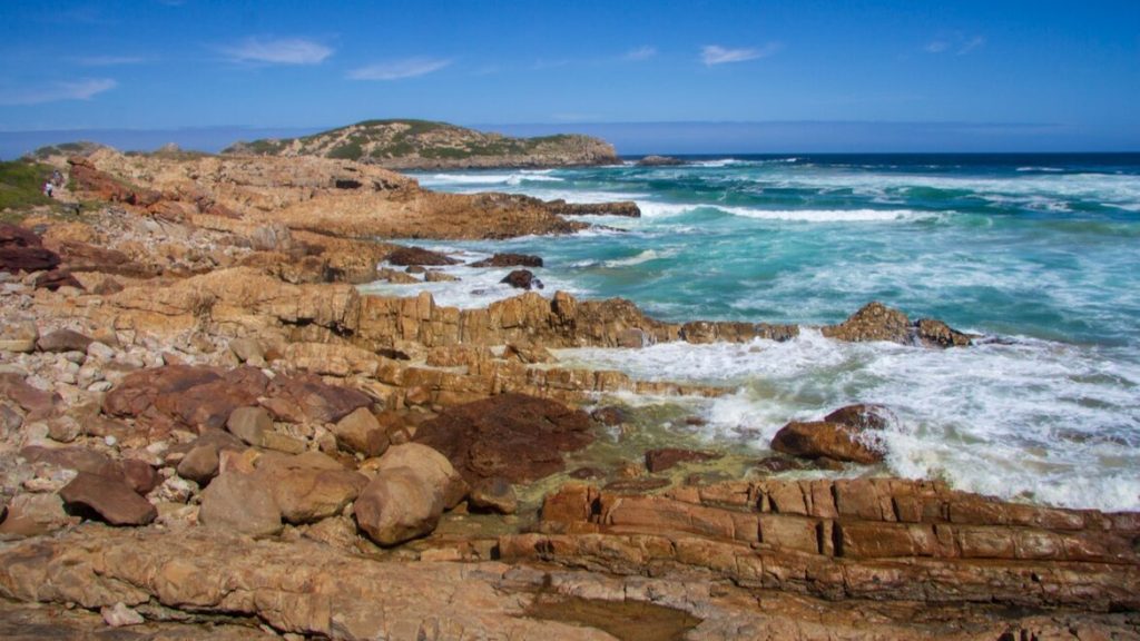 And seabirds fish from the island’s rocks. But the crashing waves on either side of a narrow beach connecting the island to the Robberg peninsula drown out their cries of victory.